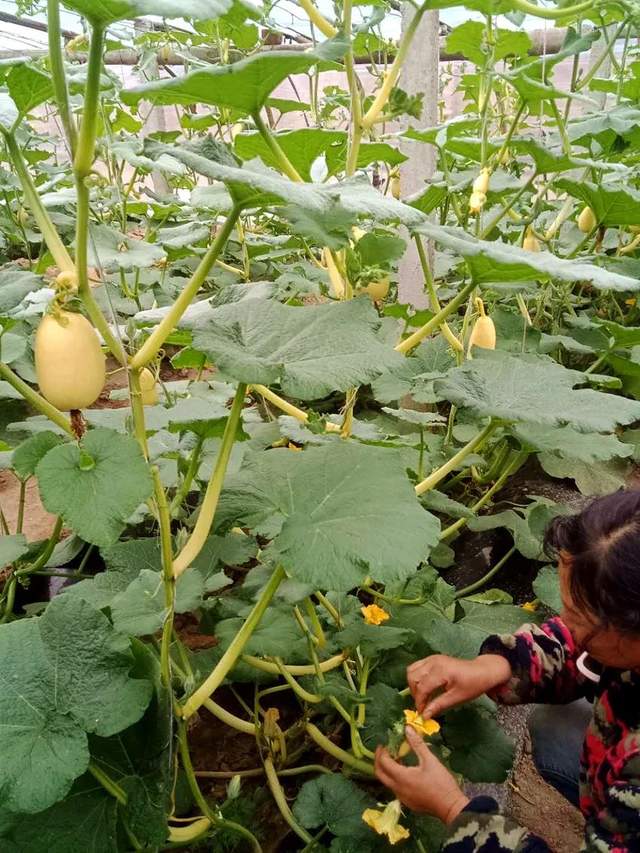 ▲無昆蟲時(shí),為“黃金筍瓜”人工授粉