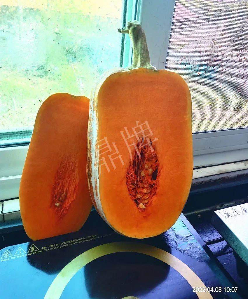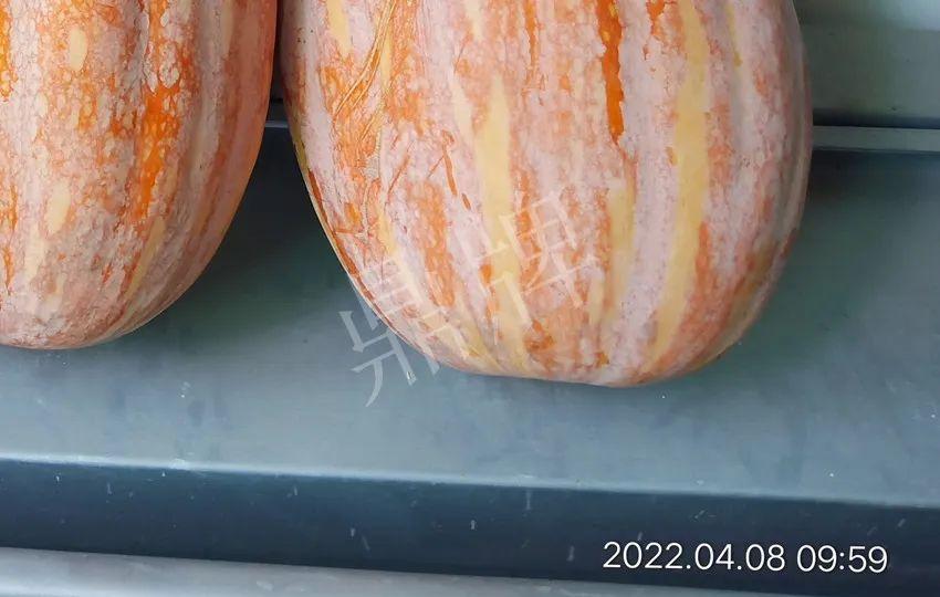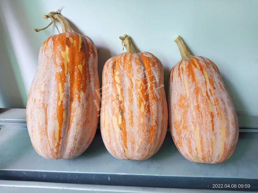 沒想到,“小胖墩”蜜本南瓜越存放越漂亮,瓜開始是粉黃色,到后面越來越紅亮(見前后照片對比)。李老板說,4月8日拍完照片后,家里吃了一個,比之前好吃了,甜度有增加,口感細(xì)膩。